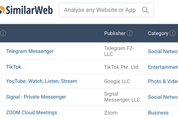 根据SimilarWeb网站1月16日的更新信息,Telegram软件下载量排名第一,Signal软件排名第四。(网站截图)